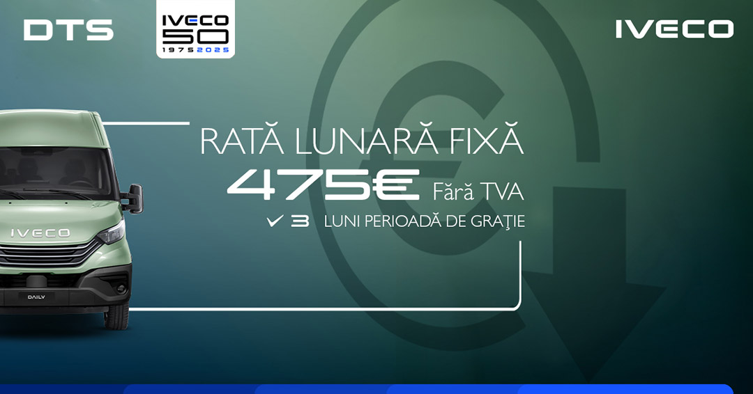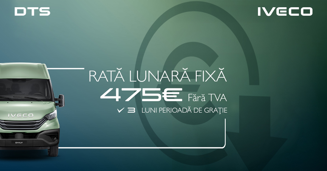 Rata de 477,19 EUR/lună fără TVA a fost calculată pentru vehicul IVECO DAILY FURGON 35S14V de 16m3, cu un avans 10%, durata contractului de finanțare de 5 ani și o valoare reziduală de 20% - care nu este condiționată de o garanție tip buy-back. Perioadă de grație de 3 luni (aplicată doar la capital).