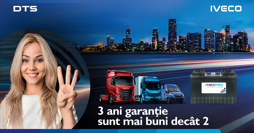 - Promoție: 36 de luni (3 ani) pentru orice baterie NEXPRO achiziționată din rețeaua de distribuitori autorizați IVECO România.